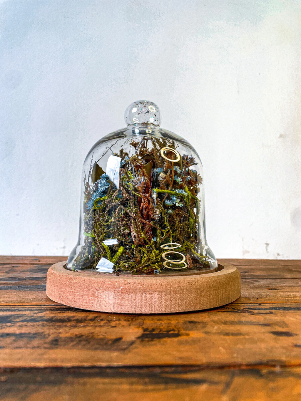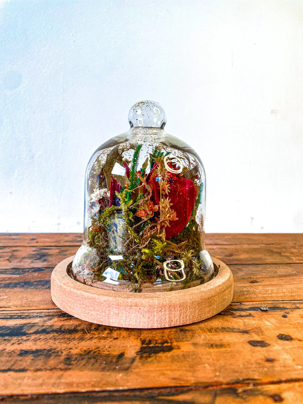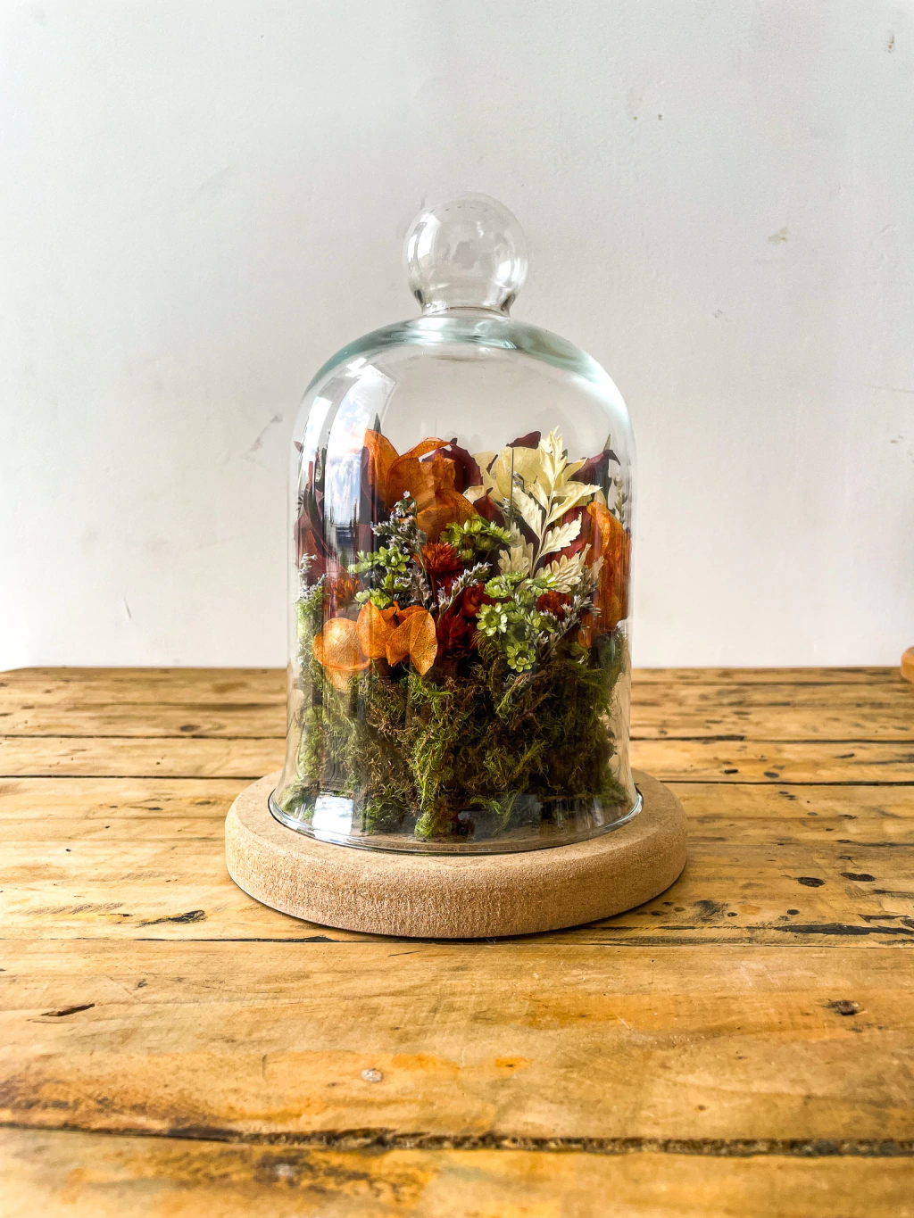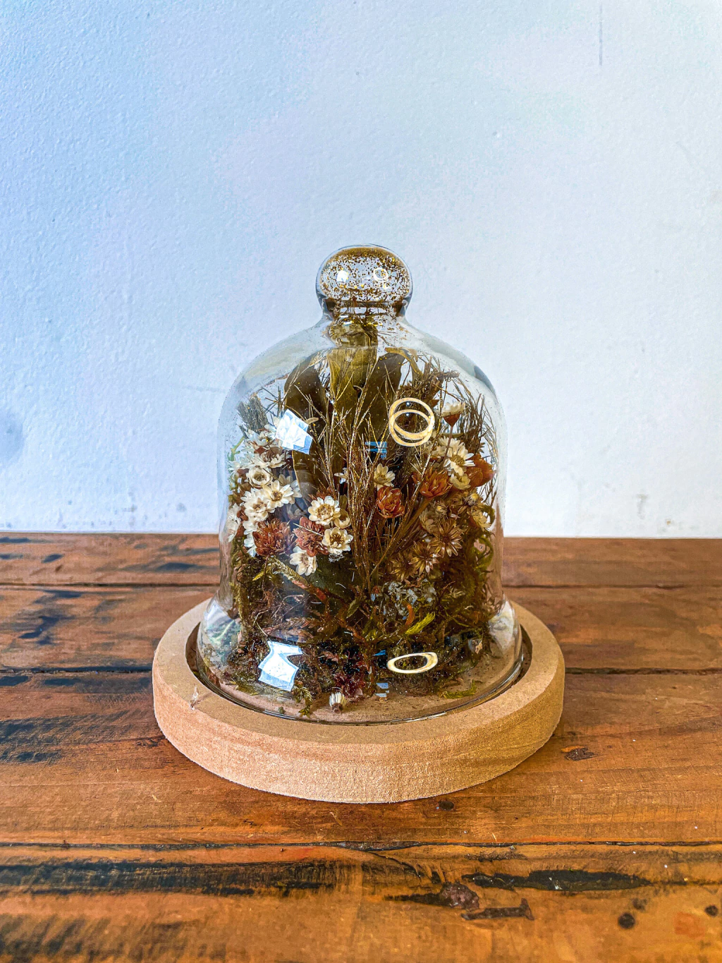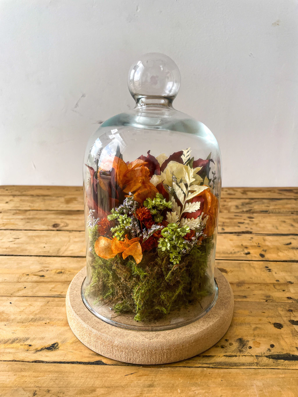 CÚPULA DE VIDRO COM FLORES DESIDRATADAS